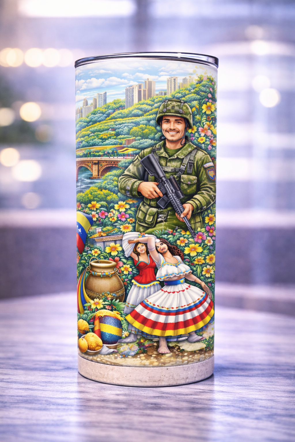 Lleva contigo el orgullo, la alegría y la cultura de Colombia con este hermoso tumbler de 20 onzas, decorado con un diseño vibrante inspirado en la tradición y riqueza cultural colombiana 🇨🇴✨
